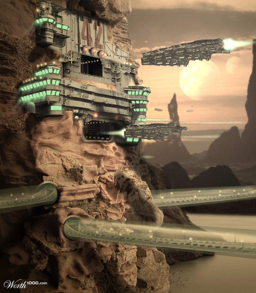 -it is hard to say what they exactaly did but i find the way they took what was probley just a clif side and turned it in to a port for transport ships some where else in the universe -this caught my eye because it has to do with place's out side of our planet and ive alway's wondered what some of those places could look like but ingenral i liked it because it had aspects of the world of tomorrow - |
