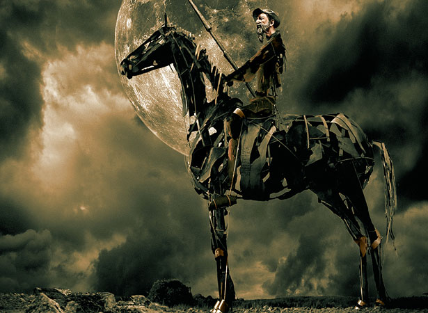 -ok to me it looks like the creator of this image took a regular peson riding a horse and turned them into a zombie like robot made out of junk it is somthing that might look pretty cool in person -apart from it looking like it could be a pece of sclupture art it has this unique vibe i get from it like it would have some inportance to to the man on the horse itself - |